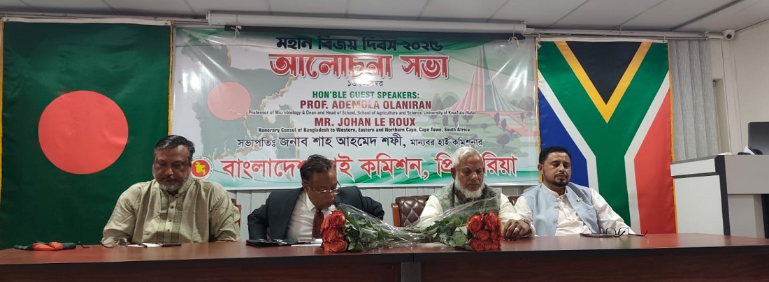 প্রিটোরিয়ায় বাংলাদেশ হাইকমিশনের উদ্যোগে মহান বিজয় দিবস ২০২৫ যথাযোগ্য মর্যাদা ও উৎসবমুখর পরিবেশে উদযাপিত হয়। অনুষ্ঠানের শুরুতে জাতীয় পতাকা উত্তোলন ও জাতীয় সংগীত পরিবেশনের মাধ্যমে বিজয় দিবসের উদযাপন শুরু হয়।