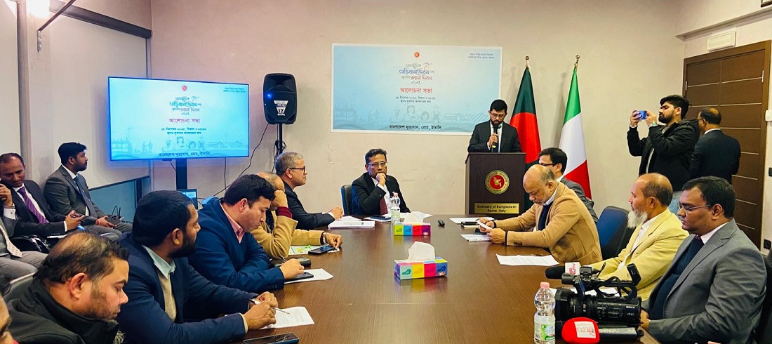 রাষ্ট্রদূত জানান, ইতালিতে প্রায় দুই লক্ষাধিক বাংলাদেশি বসবাস করছেন এবং প্রতিবছর ১.৩ বিলিয়ন মার্কিন ডলারের বেশি রেমিট্যান্স প্রেরণ করে তারা দেশের অর্থনীতিতে গুরুত্বপূর্ণ অবদান রাখছেন। তিনি প্রবাসীদের কল্যাণ ও সেবা নিশ্চিতকরণে দূতাবাসের অঙ্গীকার পুনর্ব্যক্ত করেন।