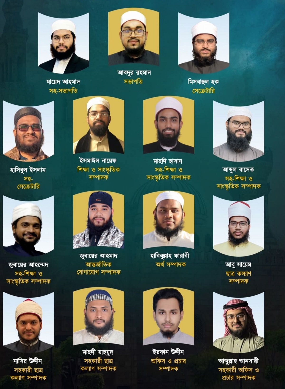 নবগঠিত ১৫ সদস্যের কমিটিতে সভাপতি নির্বাচিত হয়েছেন আবদুর রহমান মুহাম্মাদ নওয়াব। সহ-সভাপতি হিসেবে দায়িত্ব পেয়েছেন যায়েদ আহমদ এবং সাধারণ সম্পাদক নির্বাচিত হয়েছেন মুহাম্মাদ মিসবাহুল হক। অন্যান্য পদে রয়েছেন—সহকারী সাধারণ সম্পাদক মো. হাসিবুল ইসলাম, শিক্ষা ও সাংস্কৃতিক সম্পাদক মো. ইসমাঈল নায়েফ, সহকারী শিক্ষা ও সাংস্কৃতিক সম্পাদক মাহদী হাসান, আব্দুল বাসেত নাদীম ও জুবায়ের আহম্মেদ বিন শামসুল ইসলাম, তহবিল উন্নয়ন ও আন্তর্জাতিক যোগাযোগ সম্পাদক জুবায়ের আহমাদ, অর্থ সম্পাদক মুহাম্মাদ হাবিবুল্লাহ ফারাবী, ছাত্র কল্যাণ সম্পাদক মুহাম্মাদ আবু সায়েম, সহকারী ছাত্র কল্যাণ সম্পাদক নাসির আহমদ ও মুহা. মাহদী মাহমুদ হামজা, অফিস ও প্রচার সম্পাদক ইরফান উদ্দীন এবং প্রচার সম্পাদক আব্দুল্লাহ আনসারী।